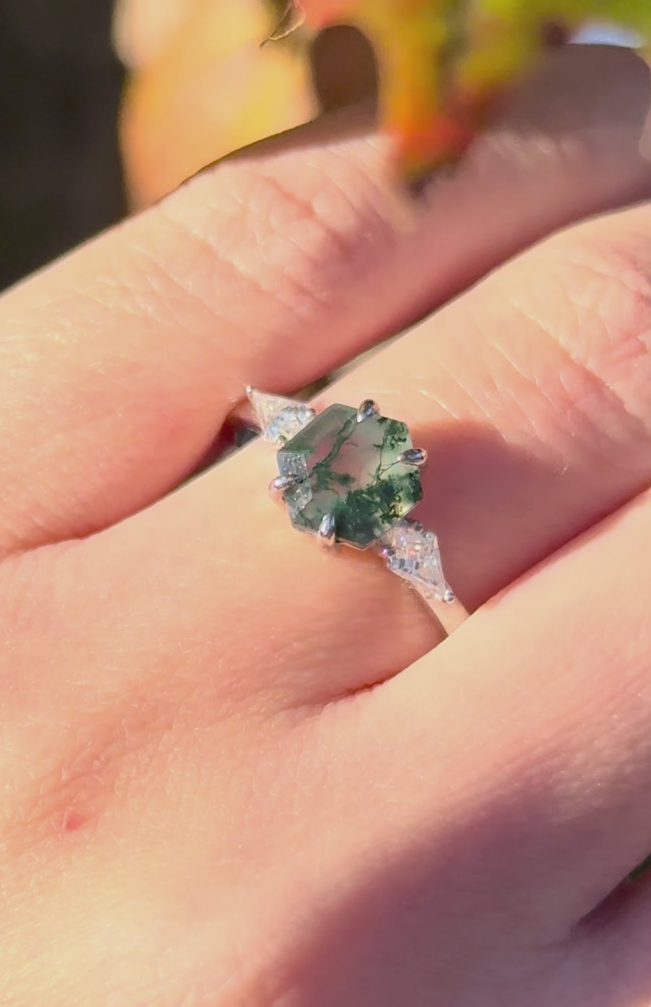 *Gem: Natural moss agate approximately 7.5mm Hexagon, accent Moissanite.