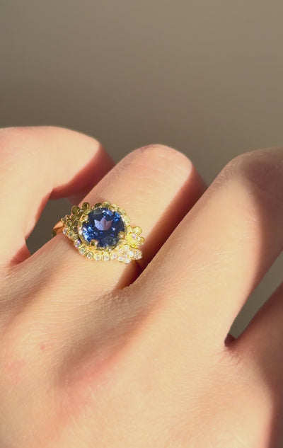 14k Yellow Gold Lab Sapphire Engagement ring, Sapphire Floral Engagement ring