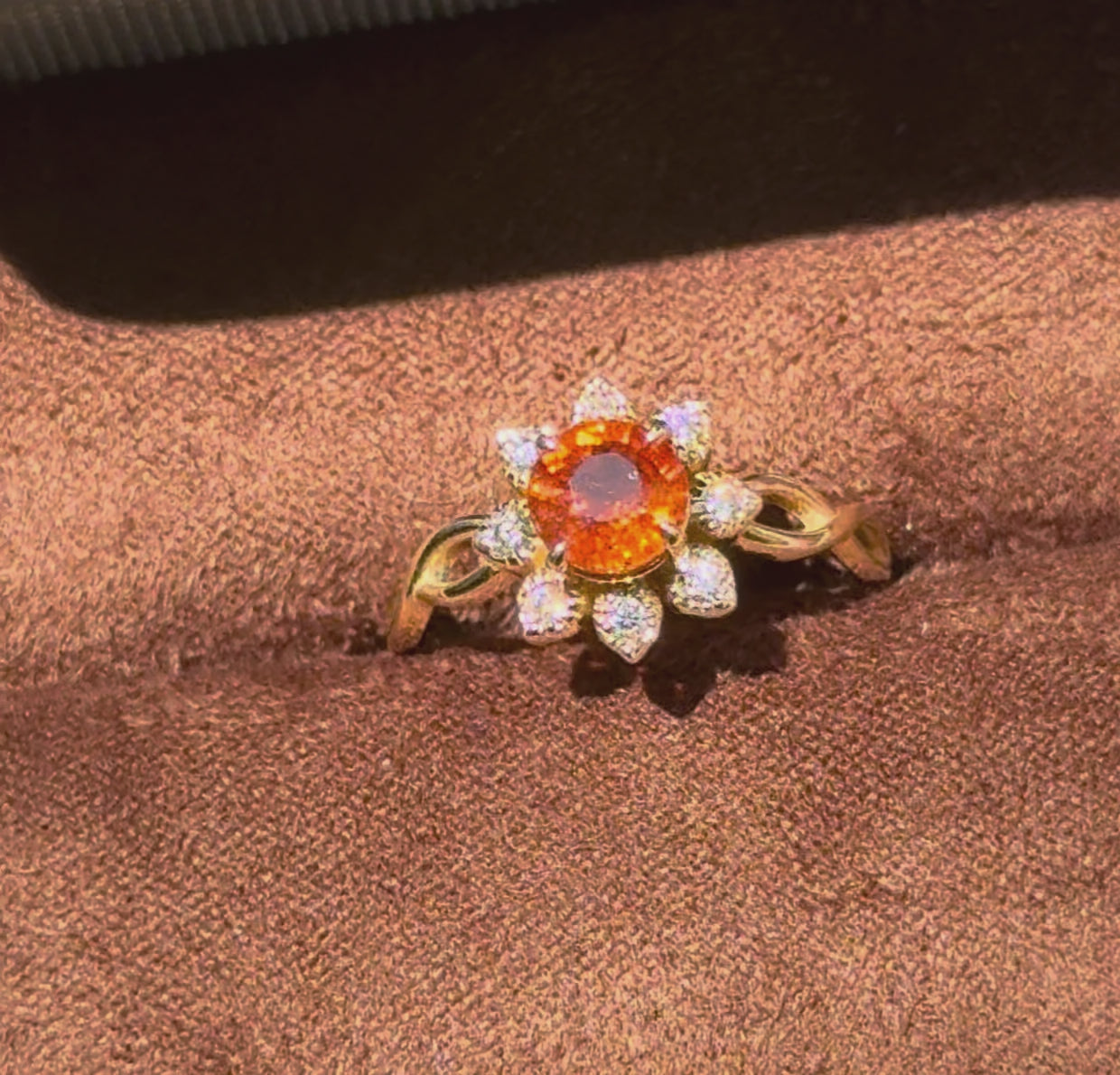 - Main Stone: Orange Garnet 5.5mm, Moissanite 2mm